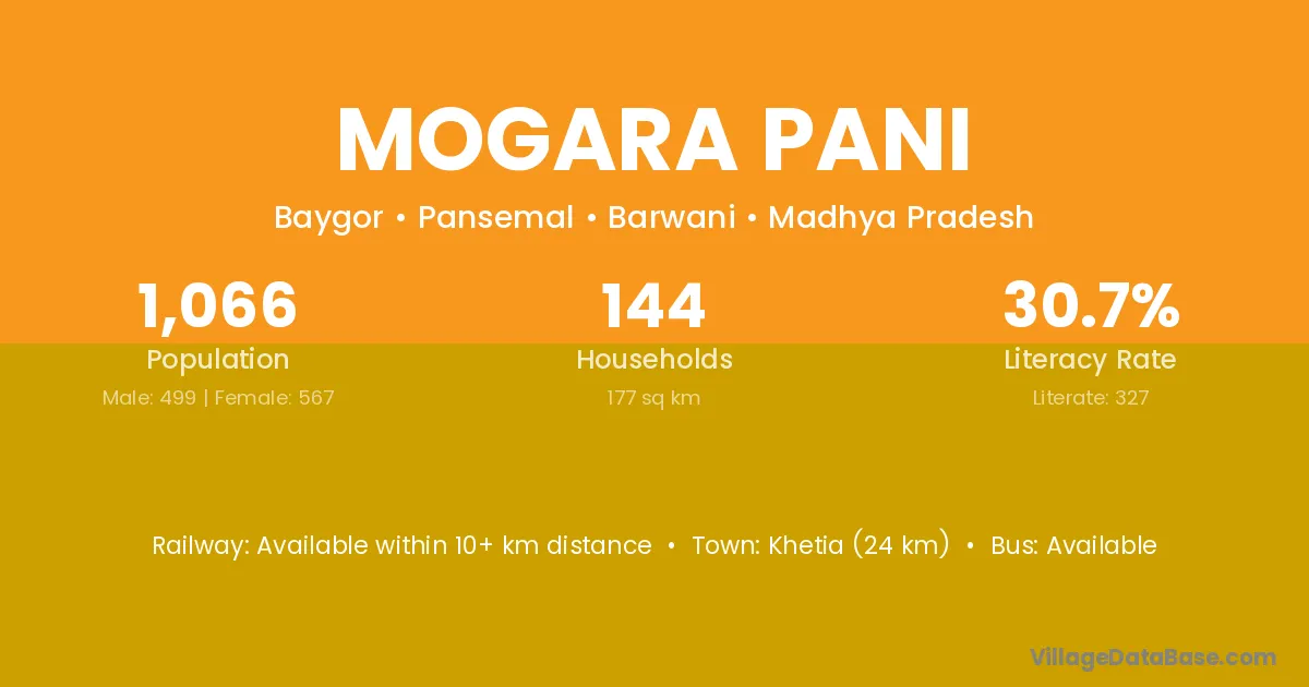 Khetia (24 km) is the nearest town to Mogara Pani village for major economic activities and is located approximately 24 km away.