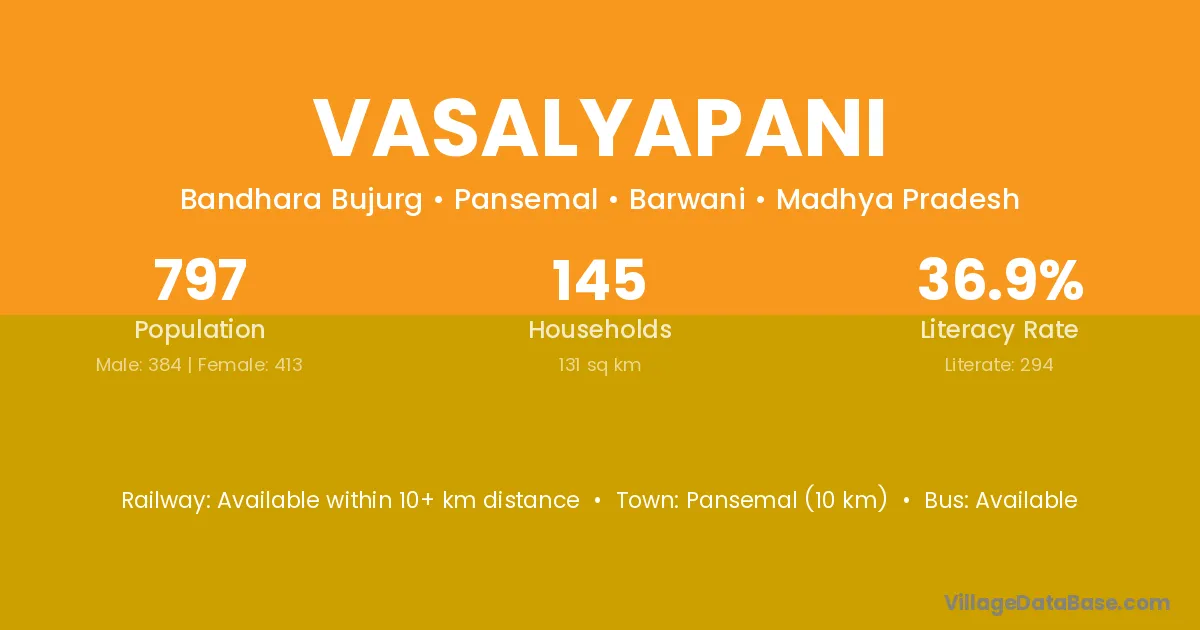 Vasalyapani village has a total population of 797 people, of which 384 are males and 413 are females.