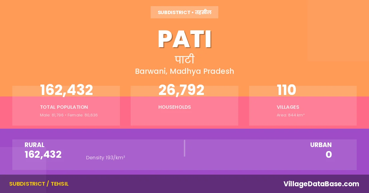 Pati is a town and Tehsil in the Barwani district of the Madhya Pradesh. In India, a Tehsil is a subdivision of a district responsible for the administration and revenue collection of a specific area within the district. Tehsils play a crucial role in the local governance structure, contributing significantly to the development and administration of their communities.