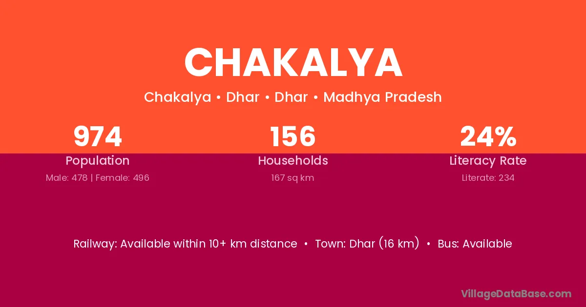 Barwani (22 km) is the nearest town to Chakalya village for major economic activities and is located approximately 22 km away.