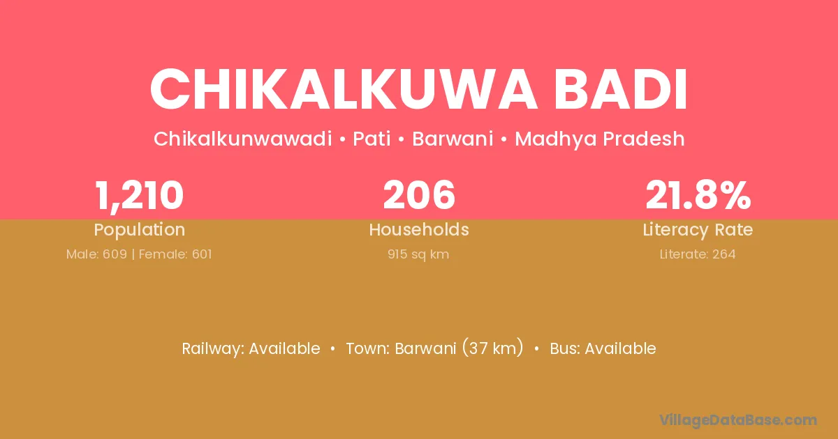 Barwani (37 km) is the nearest town to Chikalkuwa Badi village for major economic activities and is located approximately 37 km away.