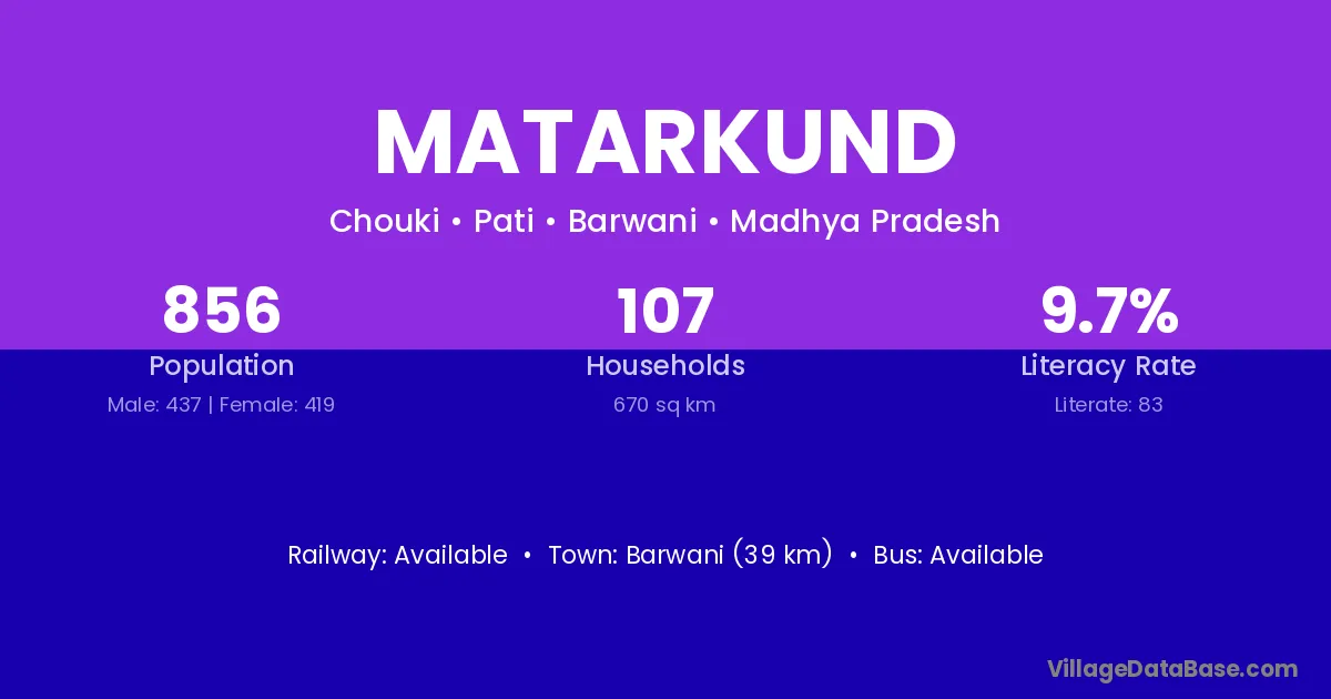 Barwani (39 km) is the nearest town to Matarkund village for major economic activities and is located approximately 39 km away.