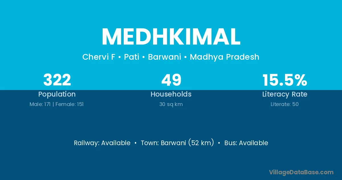 Barwani (52 km) is the nearest town to Medhkimal village for major economic activities and is located approximately 52 km away.