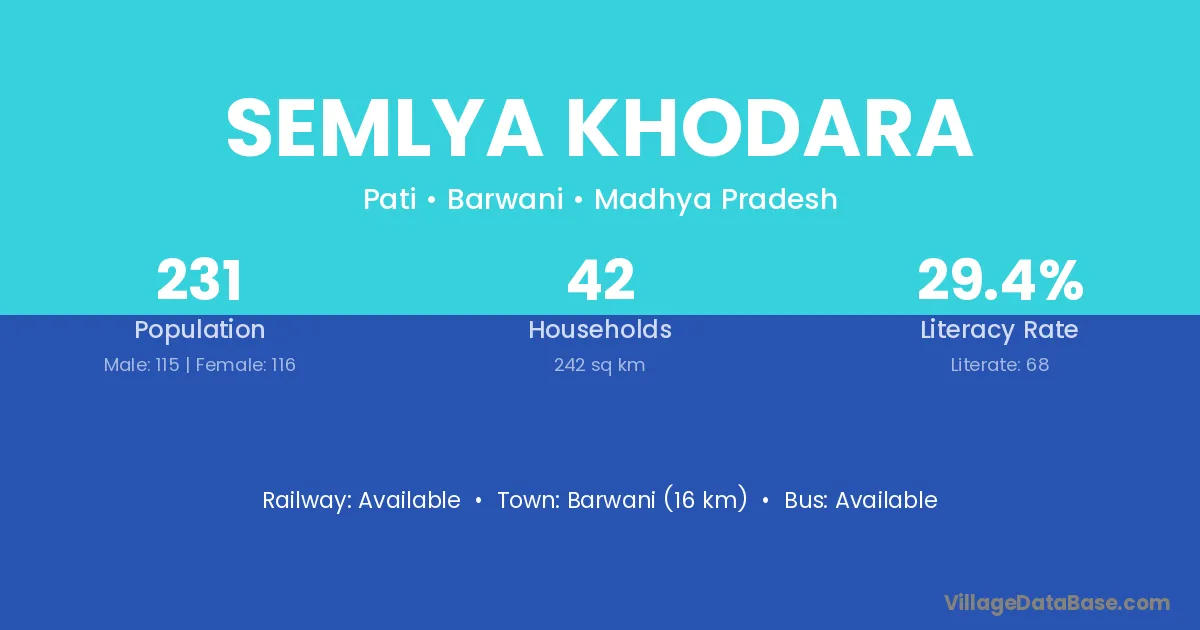 Barwani (16 km) is the nearest town to Semlya Khodara village for major economic activities and is located approximately 16 km away.