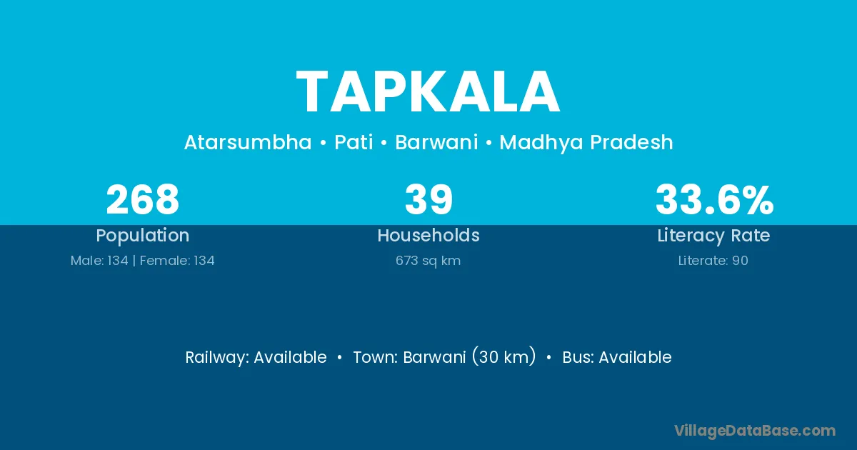 Barwani (30 km) is the nearest town to Tapkala village for major economic activities and is located approximately 30 km away.