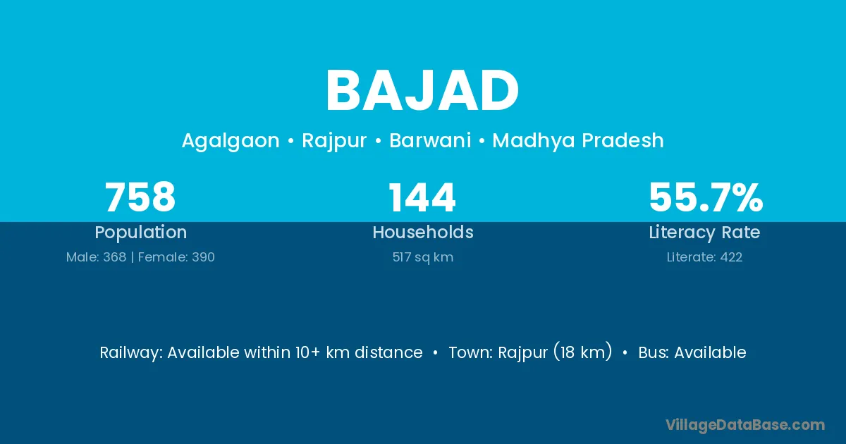 Rajpur (18 km) is the nearest town to Bajad village for major economic activities and is located approximately 18 km away.
