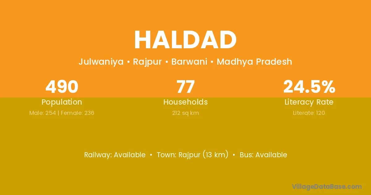 Rajpur (13 km) is the nearest town to Haldad village for major economic activities and is located approximately 13 km away.