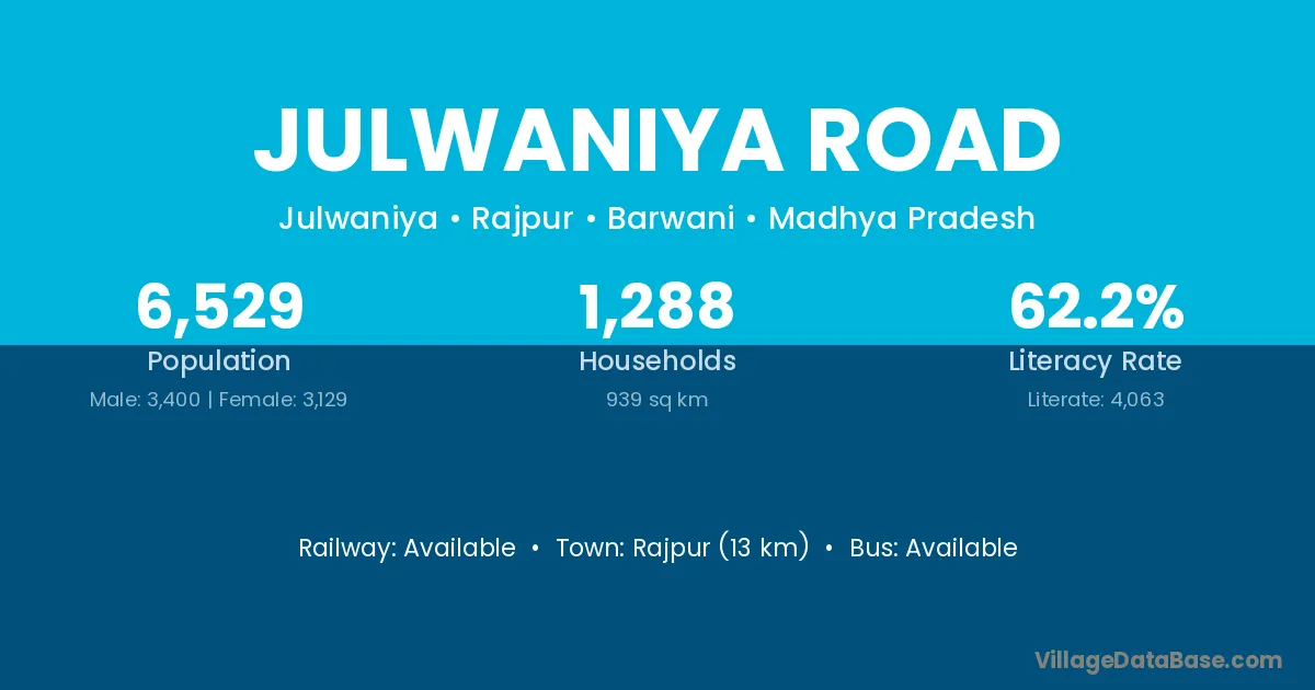 Rajpur (13 km) is the nearest town to Julwaniya Road village for major economic activities and is located approximately 13 km away.