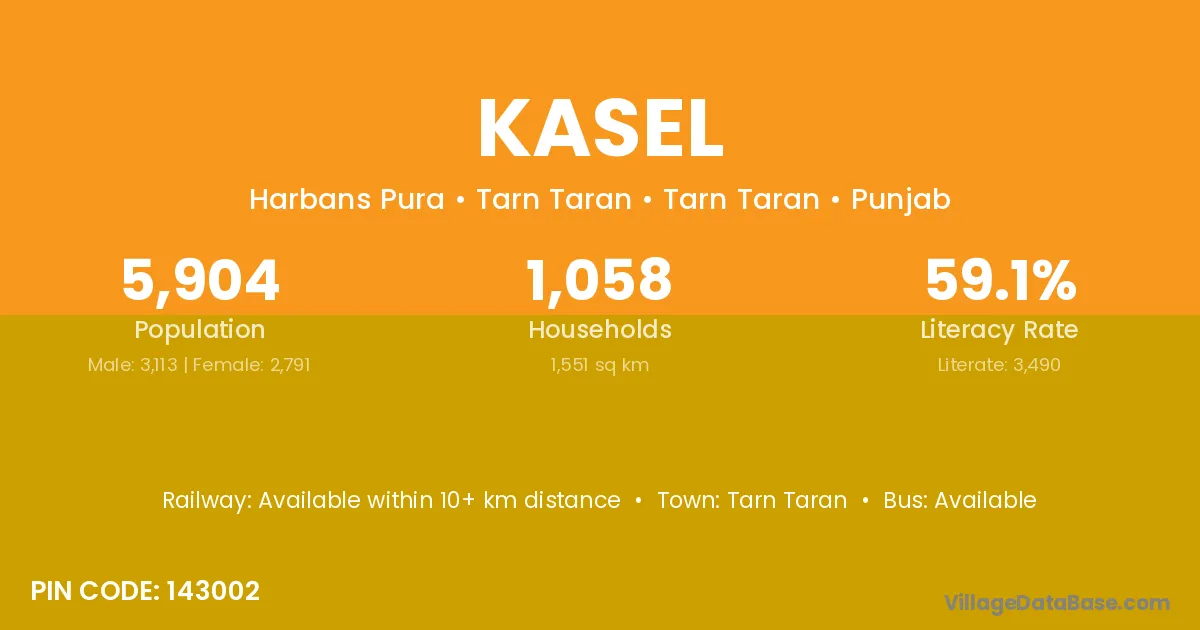 The literacy rate of Kasel village is 58.02%. Male literacy stands at 68.69% and female literacy at 47.93%.
