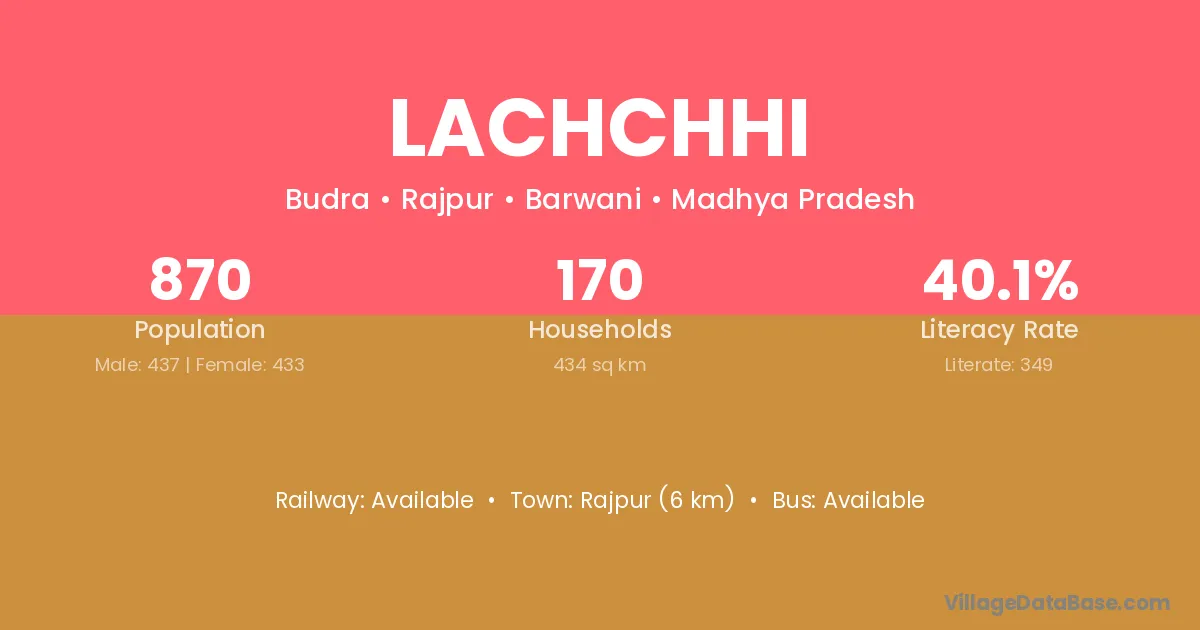 Lachchhi village has a total population of 870 people, of which 437 are males and 433 are females.