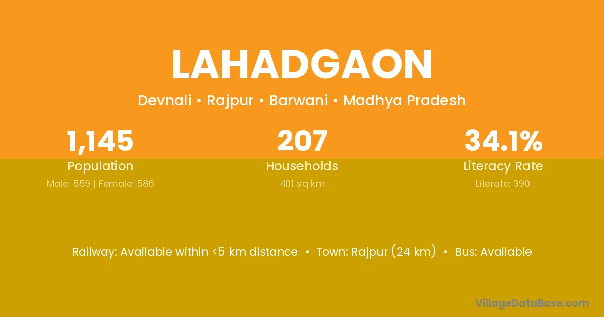 Rajpur (24 km) is the nearest town to Lahadgaon village for major economic activities and is located approximately 24 km away.