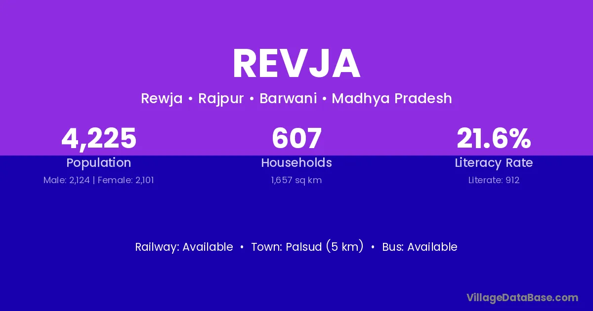 Revja village has a total population of 4,225 people, of which 2,124 are males and 2,101 are females.