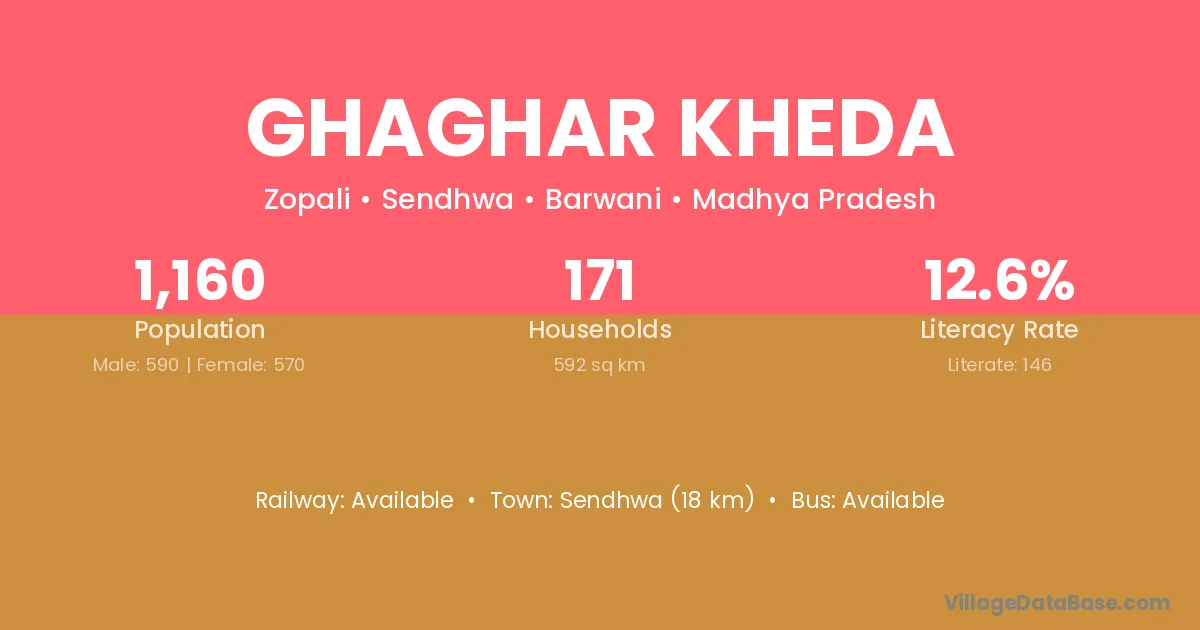 Sendhwa (18 km) is the nearest town to Ghaghar Kheda village for major economic activities and is located approximately 18 km away.