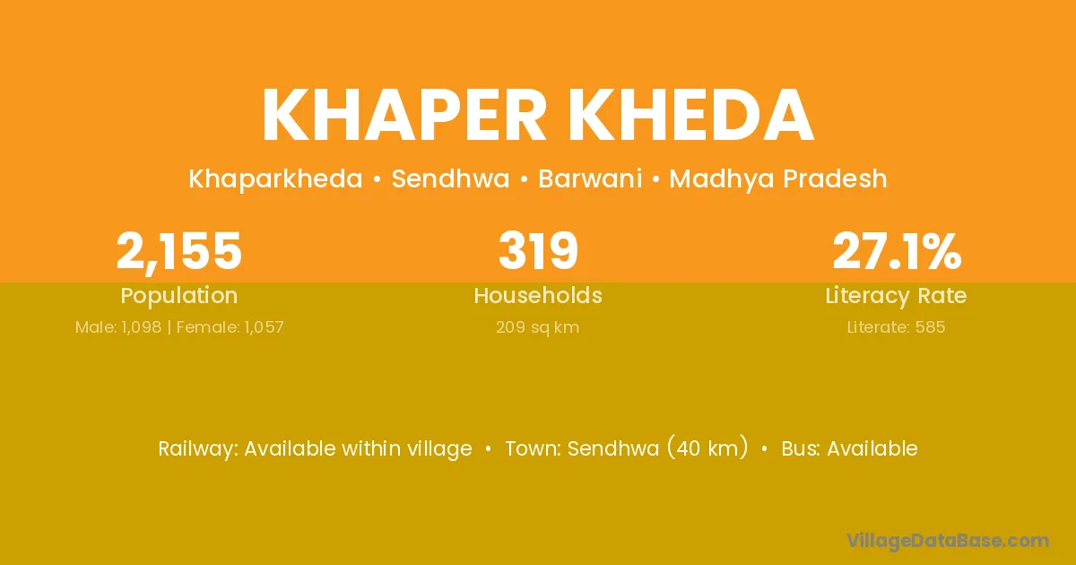 Sendhwa (40 km) is the nearest town to Khaper Kheda village for major economic activities and is located approximately 40 km away.