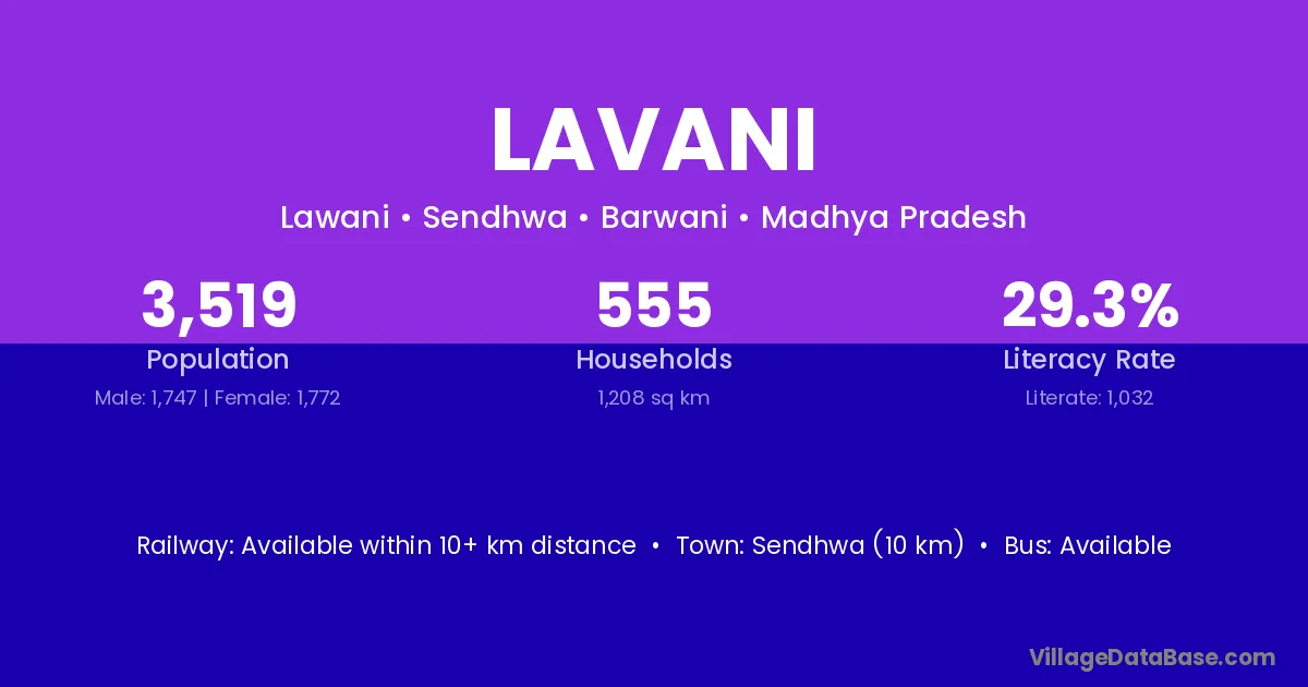 Sendhwa (10 km) is the nearest town to Lavani village for major economic activities and is located approximately 10 km away.