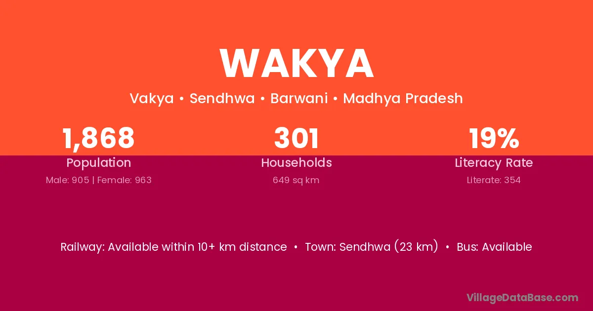 Sendhwa (23 km) is the nearest town to Wakya village for major economic activities and is located approximately 23 km away.