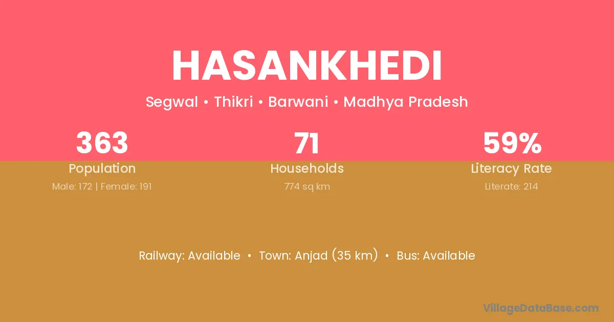 Anjad (35 km) is the nearest town to Hasankhedi village for major economic activities and is located approximately 35 km away.