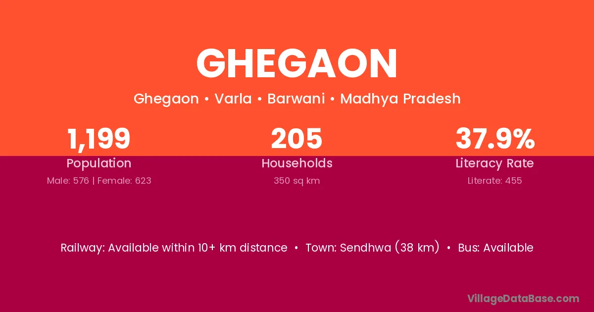 Sendhwa (38 km) is the nearest town to Ghegaon village for major economic activities and is located approximately 38 km away.