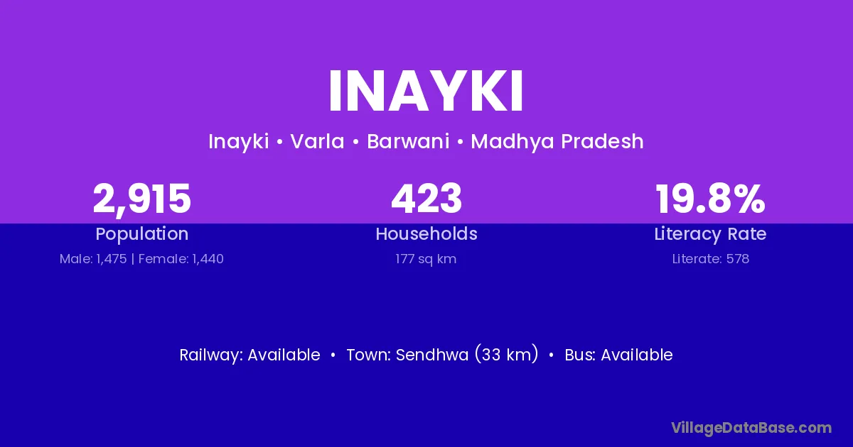 Sendhwa (33 km) is the nearest town to Inayki village for major economic activities and is located approximately 33 km away.