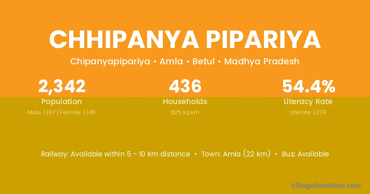 Amla (22 km) is the nearest town to Chhipanya Pipariya village for major economic activities and is located approximately 22 km away.