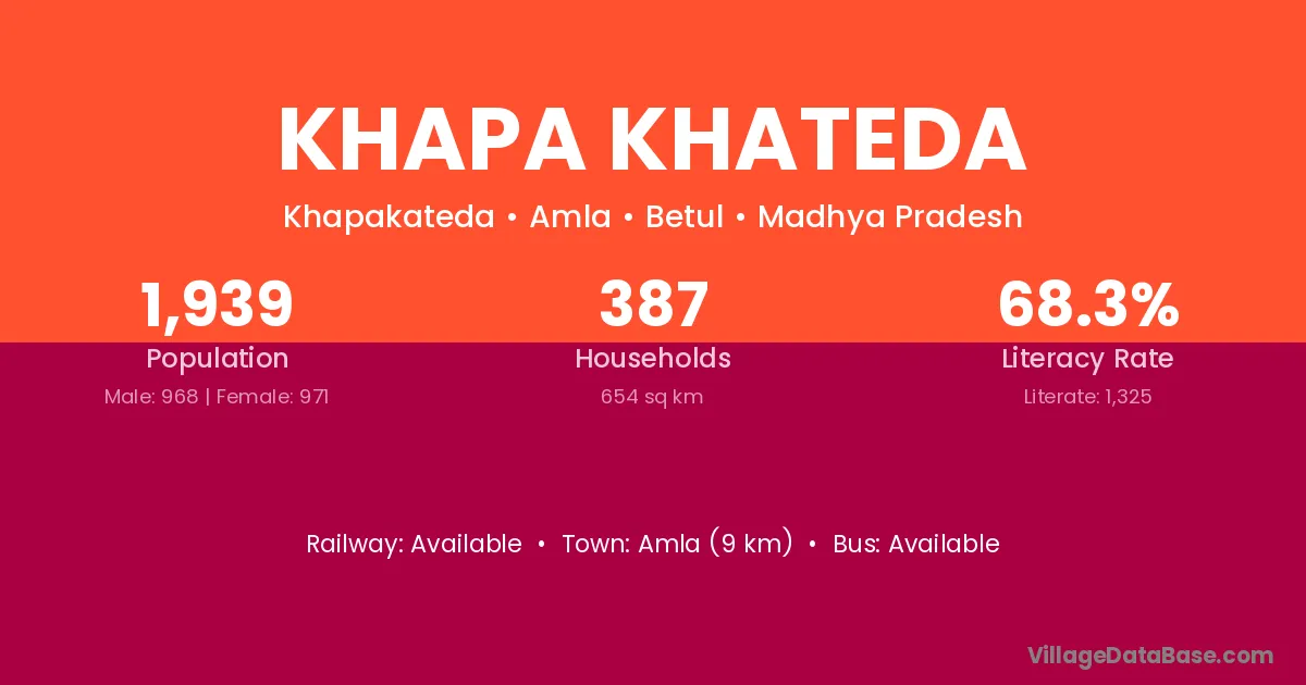 Khapa Khateda village has a total population of 1,939 people, of which 968 are males and 971 are females.
