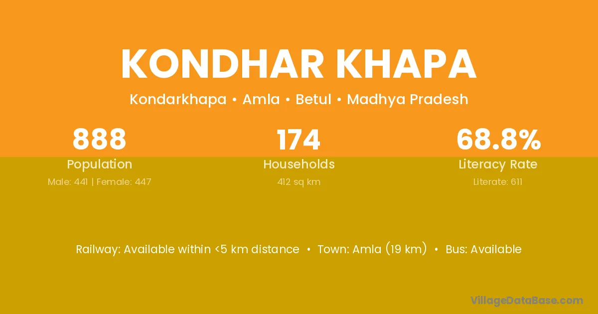 Kondhar Khapa village has a total population of 888 people, of which 441 are males and 447 are females.