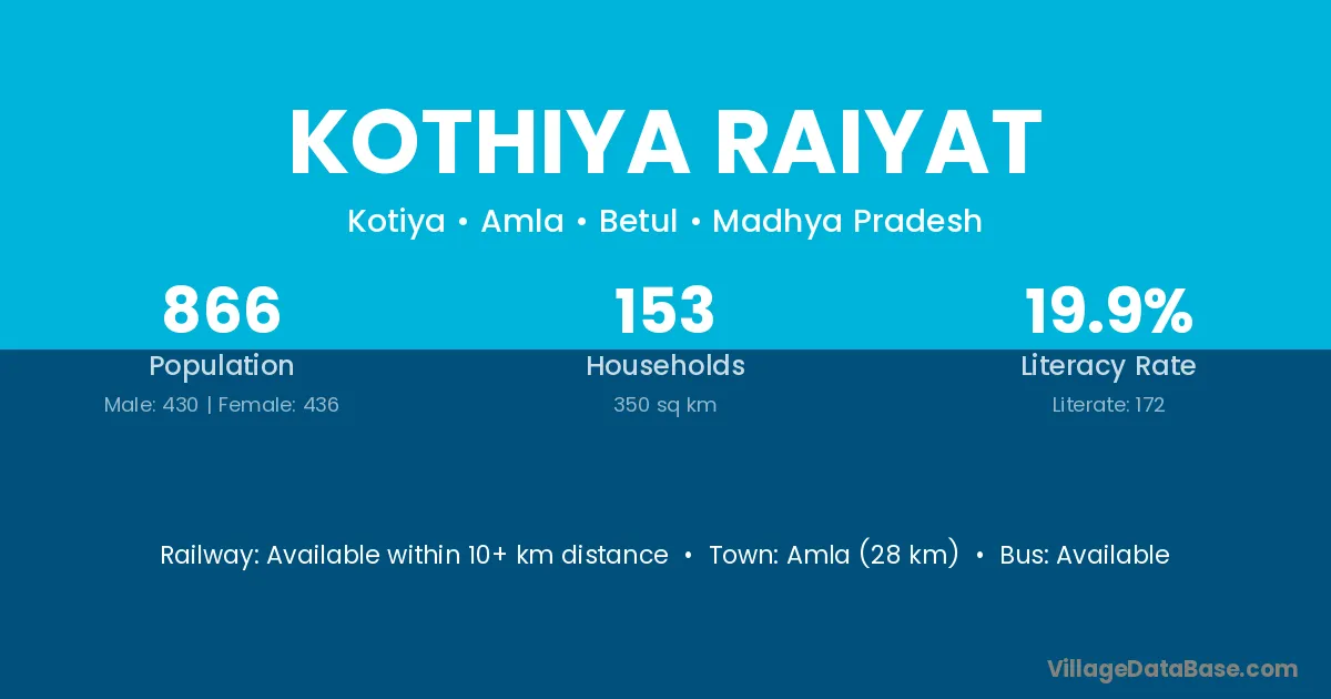 Kothiya Raiyat village has a total population of 866 people, of which 430 are males and 436 are females.