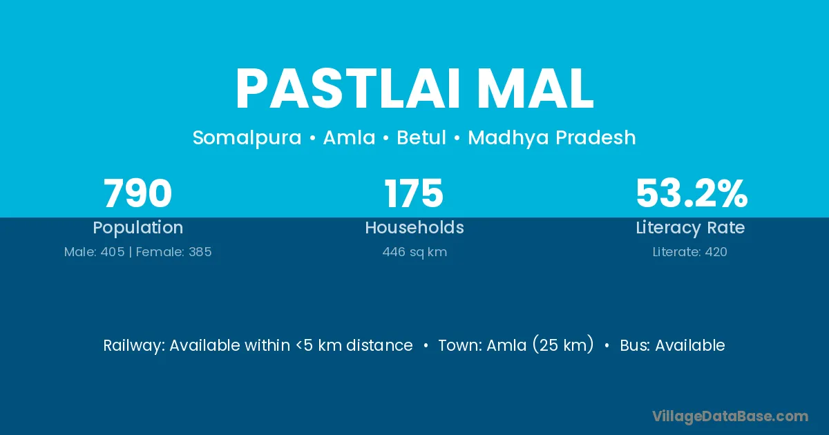Amla (25 km) is the nearest town to Pastlai Mal village for major economic activities and is located approximately 25 km away.