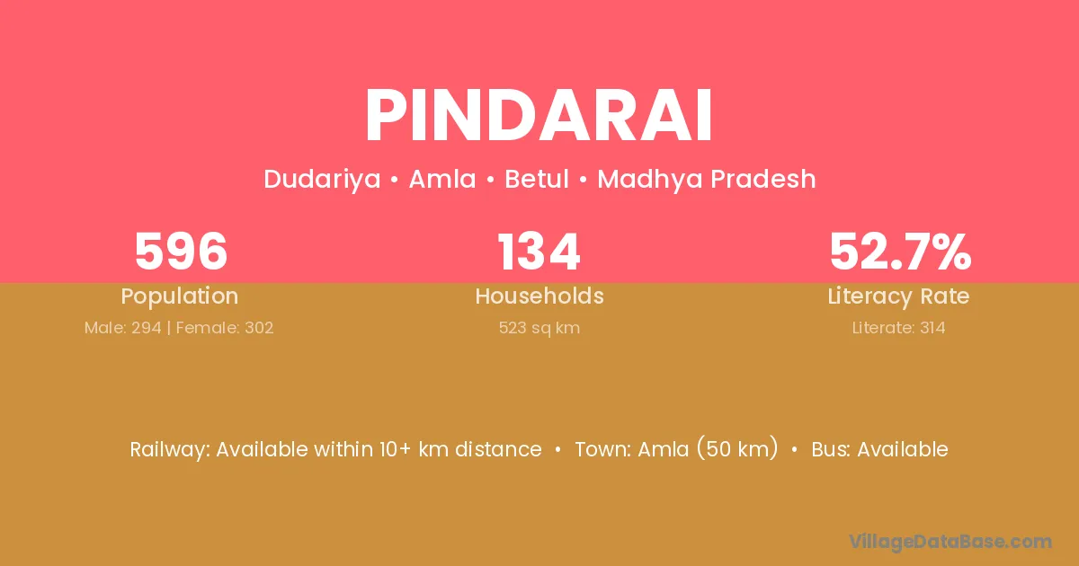 Amla (50 km) is the nearest town to Pindarai village for major economic activities and is located approximately 50 km away.