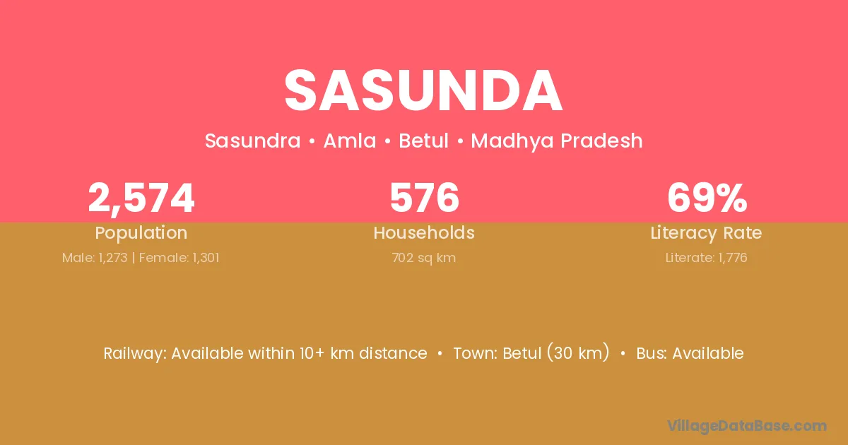 Betul (30 km) is the nearest town to Sasunda village for major economic activities and is located approximately 30 km away.