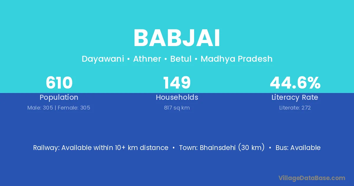 Bhainsdehi (30 km) is the nearest town to Babjai village for major economic activities and is located approximately 30 km away.