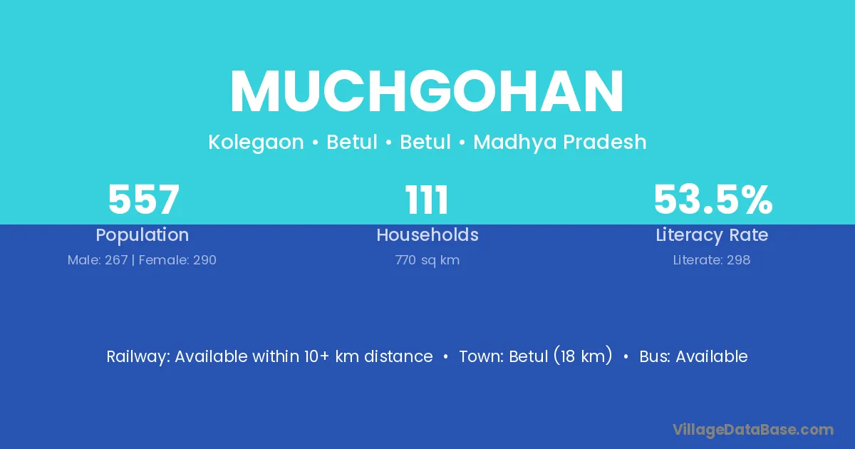Betul (18 km) is the nearest town to Muchgohan village for major economic activities and is located approximately 18 km away.