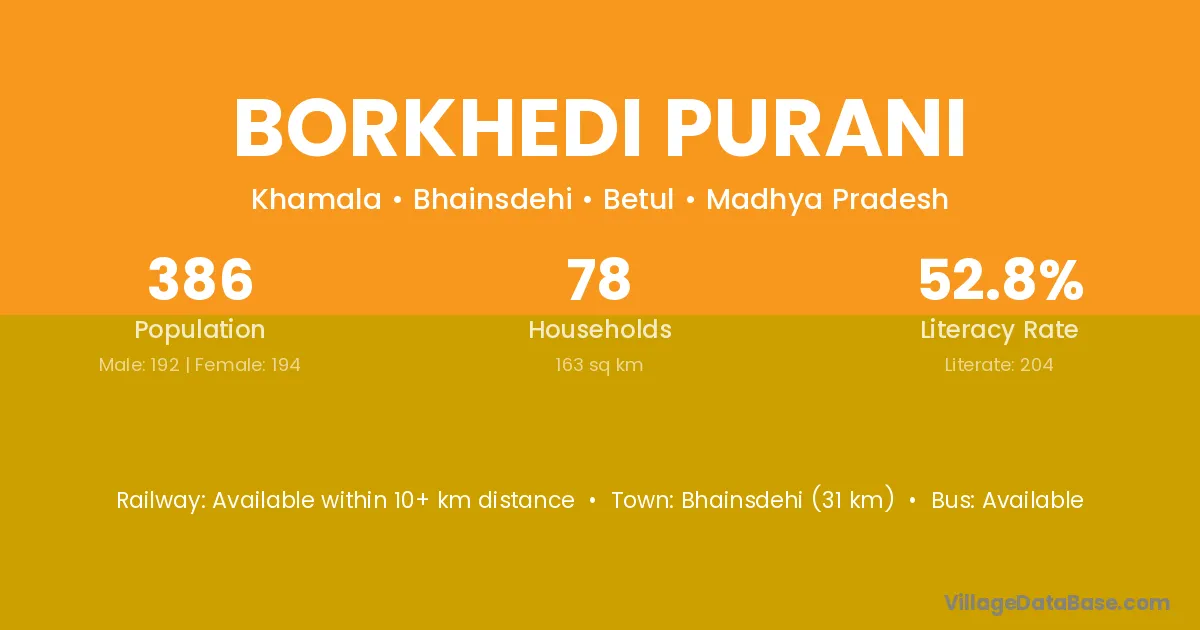 Borkhedi Purani village has a total population of 386 people, of which 192 are males and 194 are females.