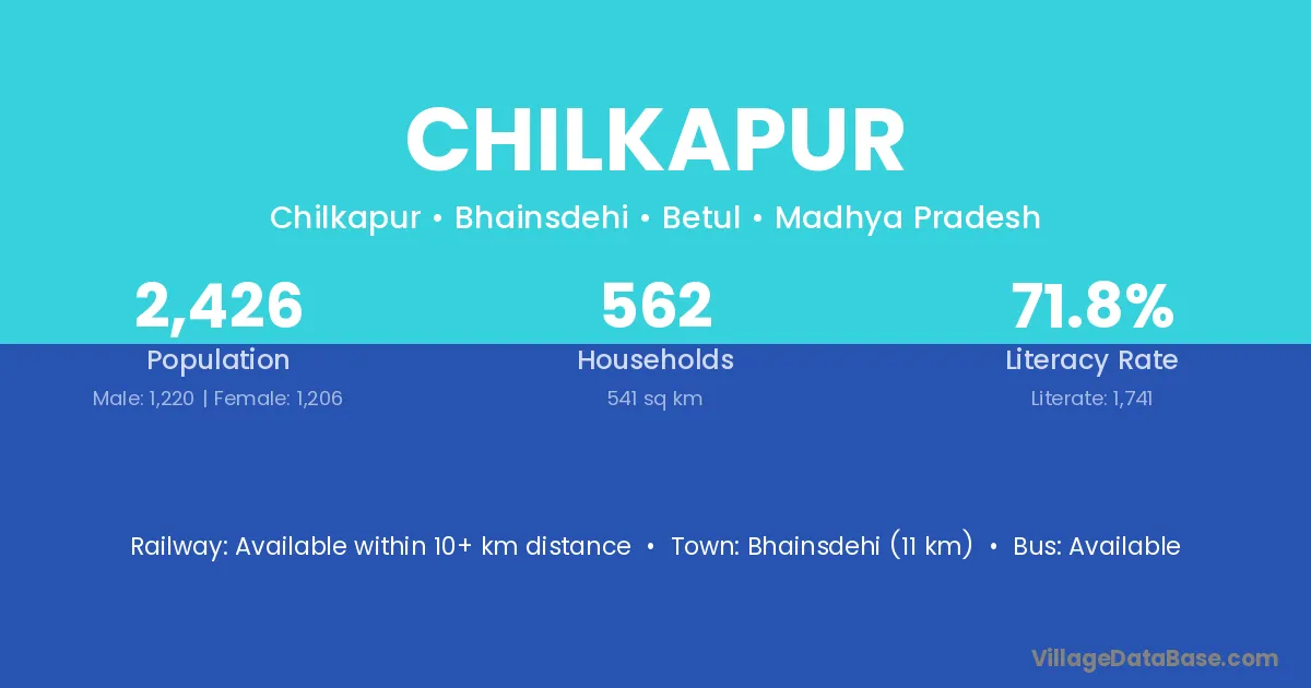 Bhainsdehi (11 km) is the nearest town to Chilkapur village for major economic activities and is located approximately 11 km away.