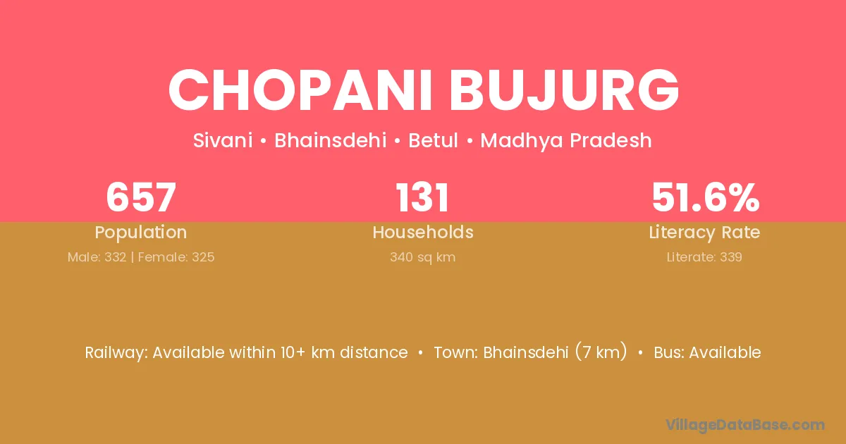 Bhainsdehi (7 km) is the nearest town to Chopani Bujurg village for major economic activities and is located approximately 7 km away.