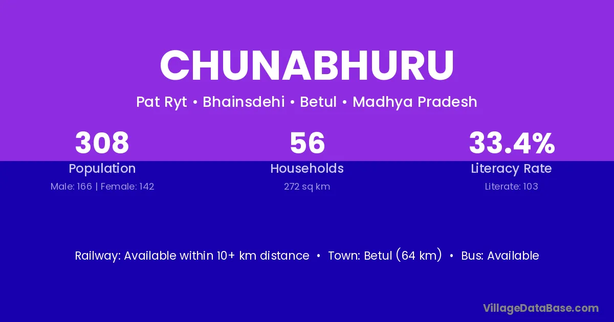 Betul (64 km) is the nearest town to Chunabhuru village for major economic activities and is located approximately 64 km away.