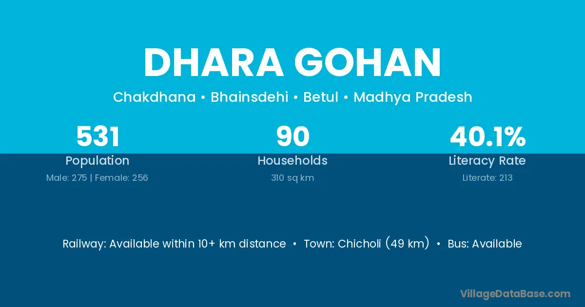 Chicholi (49 km) is the nearest town to Dhara Gohan village for major economic activities and is located approximately 49 km away.