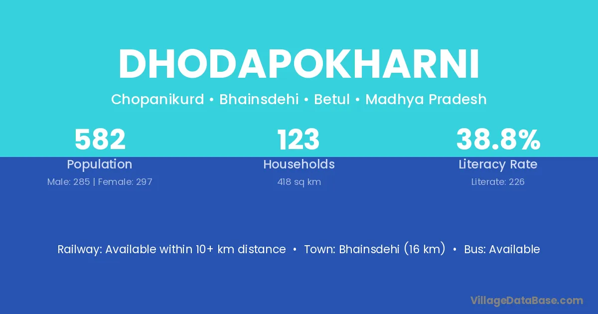 Bhainsdehi (16 km) is the nearest town to Dhodapokharni village for major economic activities and is located approximately 16 km away.