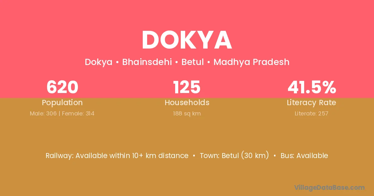 Betul (30 km) is the nearest town to Dokya village for major economic activities and is located approximately 30 km away.