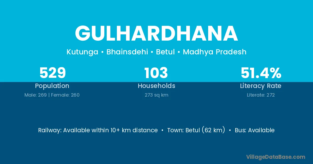 Betul (62 km) is the nearest town to Gulhardhana village for major economic activities and is located approximately 62 km away.