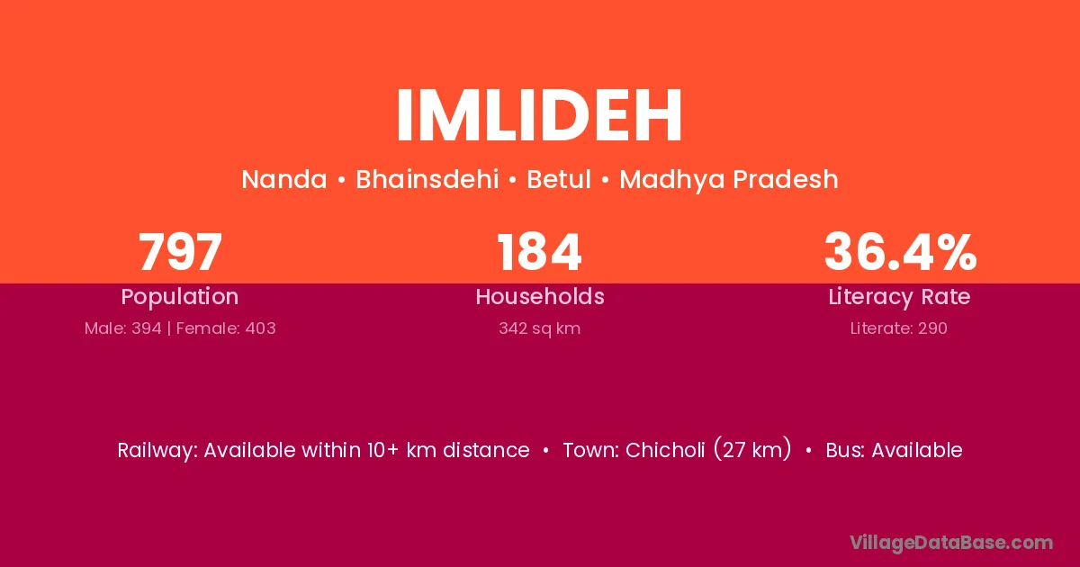Chicholi (27 km) is the nearest town to Imlideh village for major economic activities and is located approximately 27 km away.