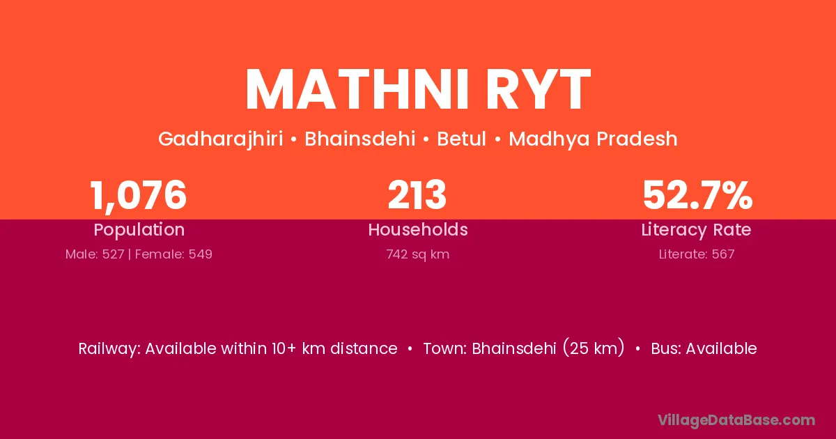 Bhainsdehi (25 km) is the nearest town to Mathni Ryt village for major economic activities and is located approximately 25 km away.