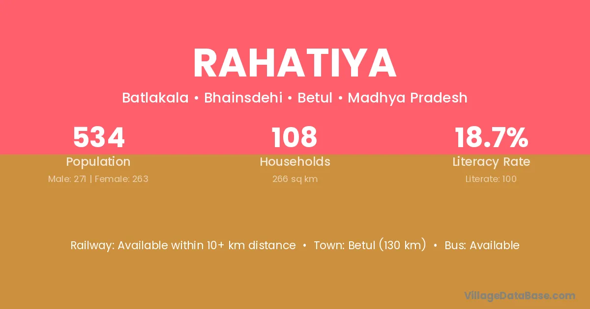 Betul (130 km) is the nearest town to Rahatiya village for major economic activities and is located approximately 130 km away.