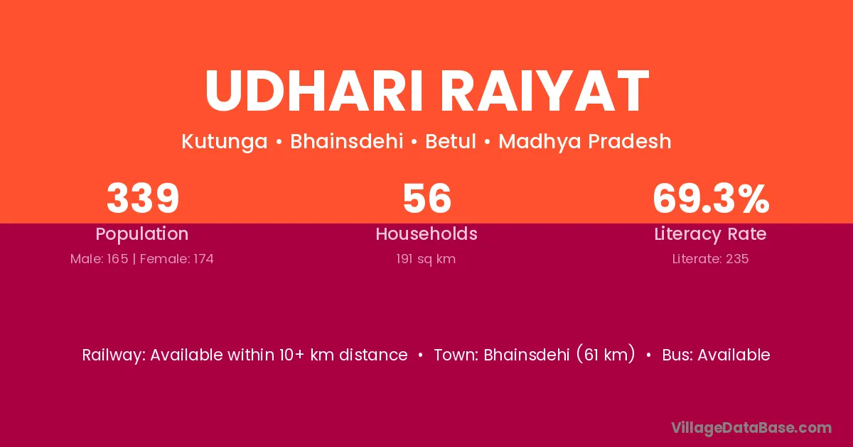 Udhari Raiyat village has a total population of 339 people, of which 165 are males and 174 are females.