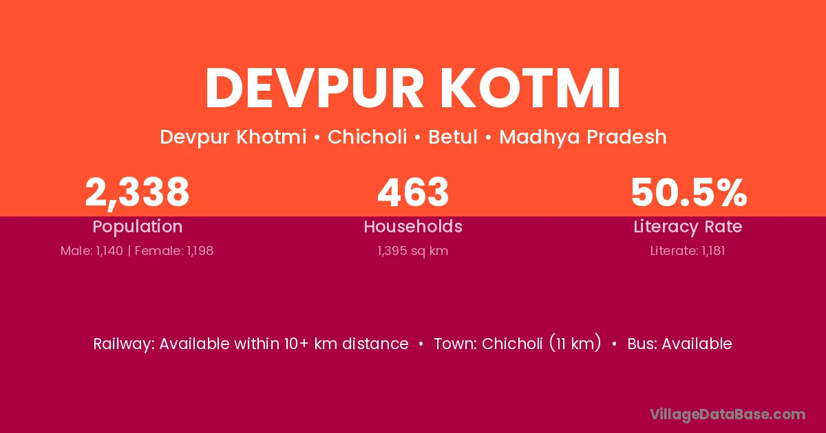 Chicholi (11 km) is the nearest town to Devpur Kotmi village for major economic activities and is located approximately 11 km away.