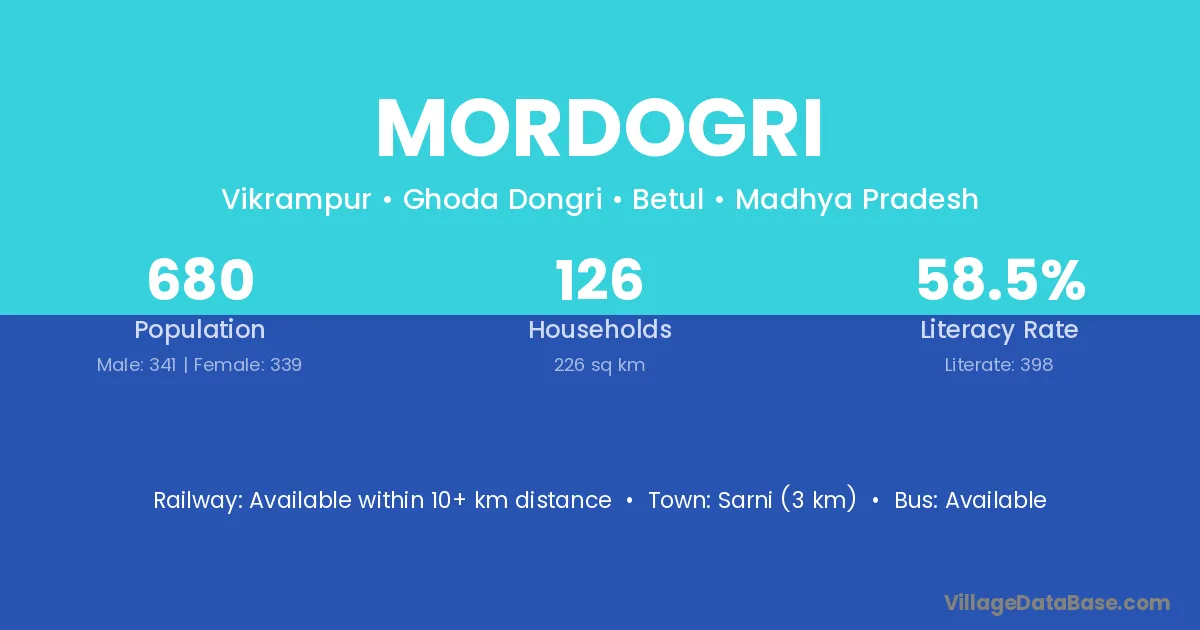 Sarni (3 km) is the nearest town to Mordogri village for major economic activities and is located approximately 3 km away.