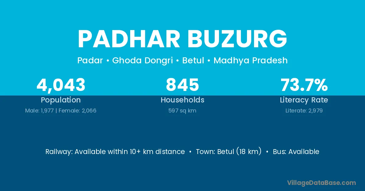 Betul (18 km) is the nearest town to Padhar Buzurg village for major economic activities and is located approximately 18 km away.