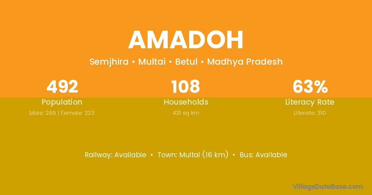 Multai (16 km) is the nearest town to Amadoh village for major economic activities and is located approximately 16 km away.