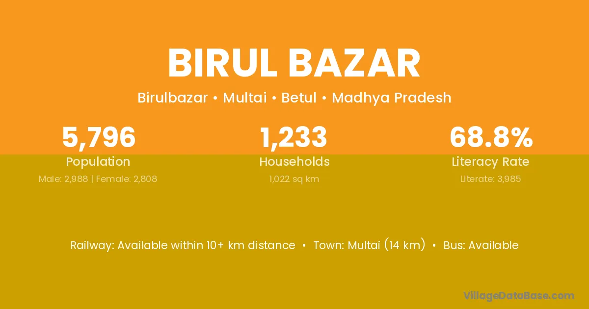 Multai (14 km) is the nearest town to Birul Bazar village for major economic activities and is located approximately 14 km away.