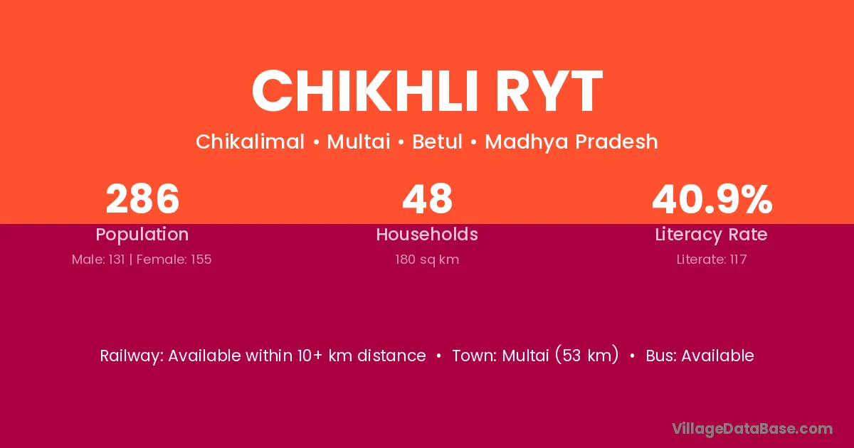 Multai (53 km) is the nearest town to Chikhli Ryt village for major economic activities and is located approximately 53 km away.